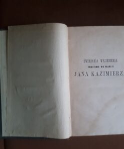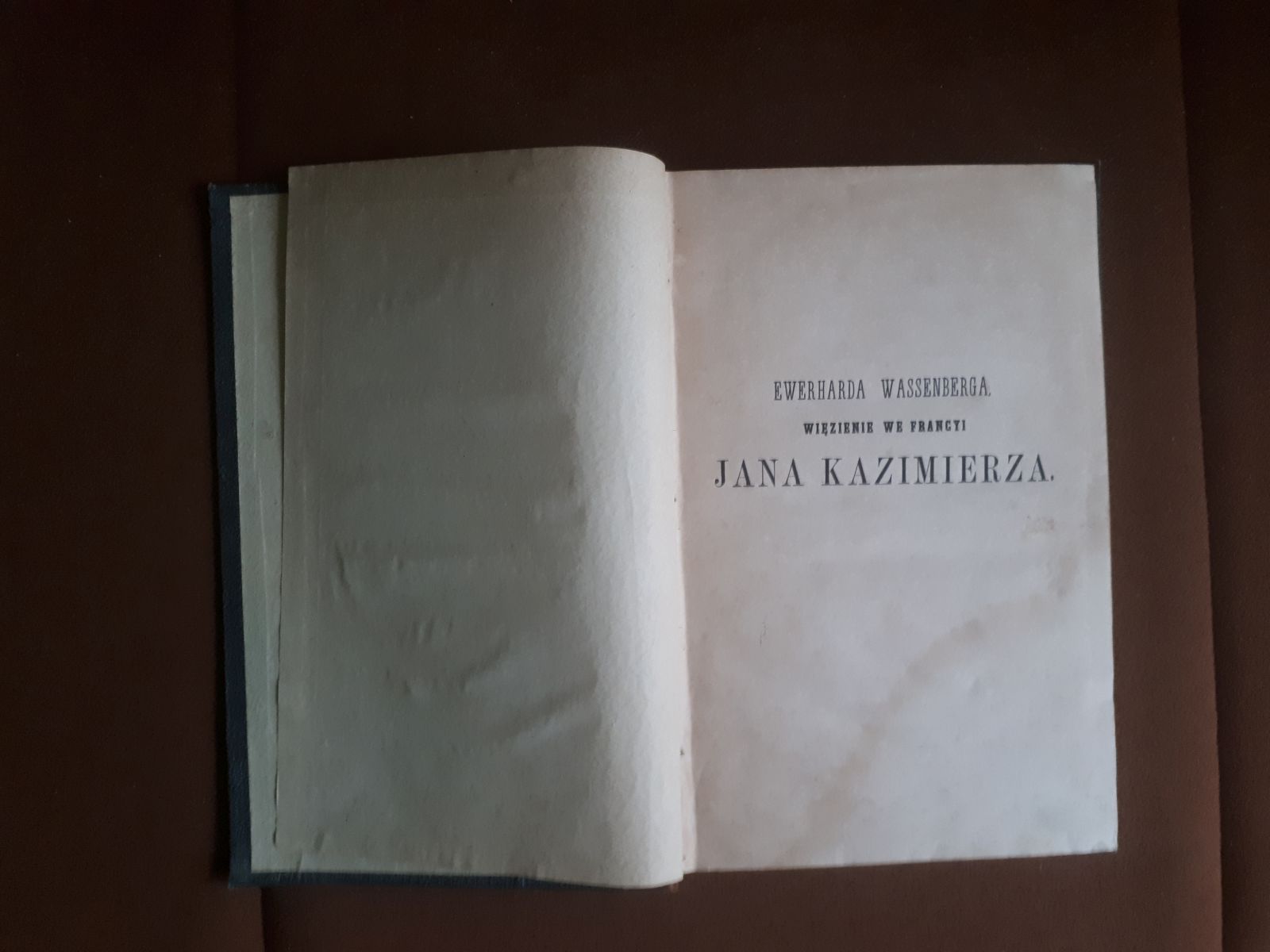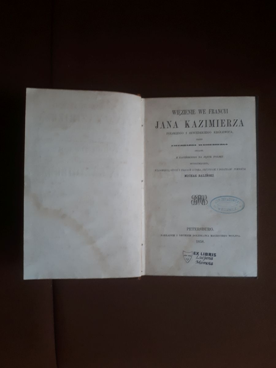 „Więzienie we Francyi Jana Kazimierza polskiego i szwedzkiego królewica” Ewerhard Wassenberg Wydana nakładem i drukiem Bolesława Maurycego Wolfa 1 1858 roku w Petersburgu. Stan ksiązki dobry; na kilku pierwszych stronach i kilku ostatnich ślady po zamoczeniu. Nie mają wpływu na czytelność tekstu. Półskórek, ilość stron 185. Książka była swojego czasu własnością Jana Żelazowskiego ze Stopnicy / był aptekarzem/ oraz , już współcześnie, Lucjana Momota, zasłużony mieszkaniec Świdnicy;