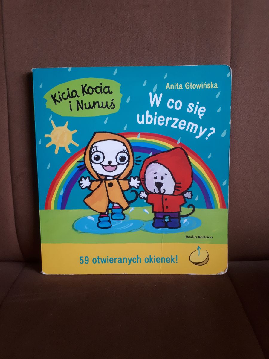Kicia Kocia i Nunuś wiedzą, że w każdą pogodę można się dobrze bawić, trzeba się tylko odpowiednio ubrać. Nunuś wkłada kalosze, kiedy pada, ubiera się ciepło, kiedy jest mroźnie, a na plażę zabiera okulary przeciwsłoneczne i krem z filtrem. Nunuś wie już wszystko o pogodzie! Wszystkie odpowiednie ubrania i przedmioty ukryte są w otwieranych okienkach.