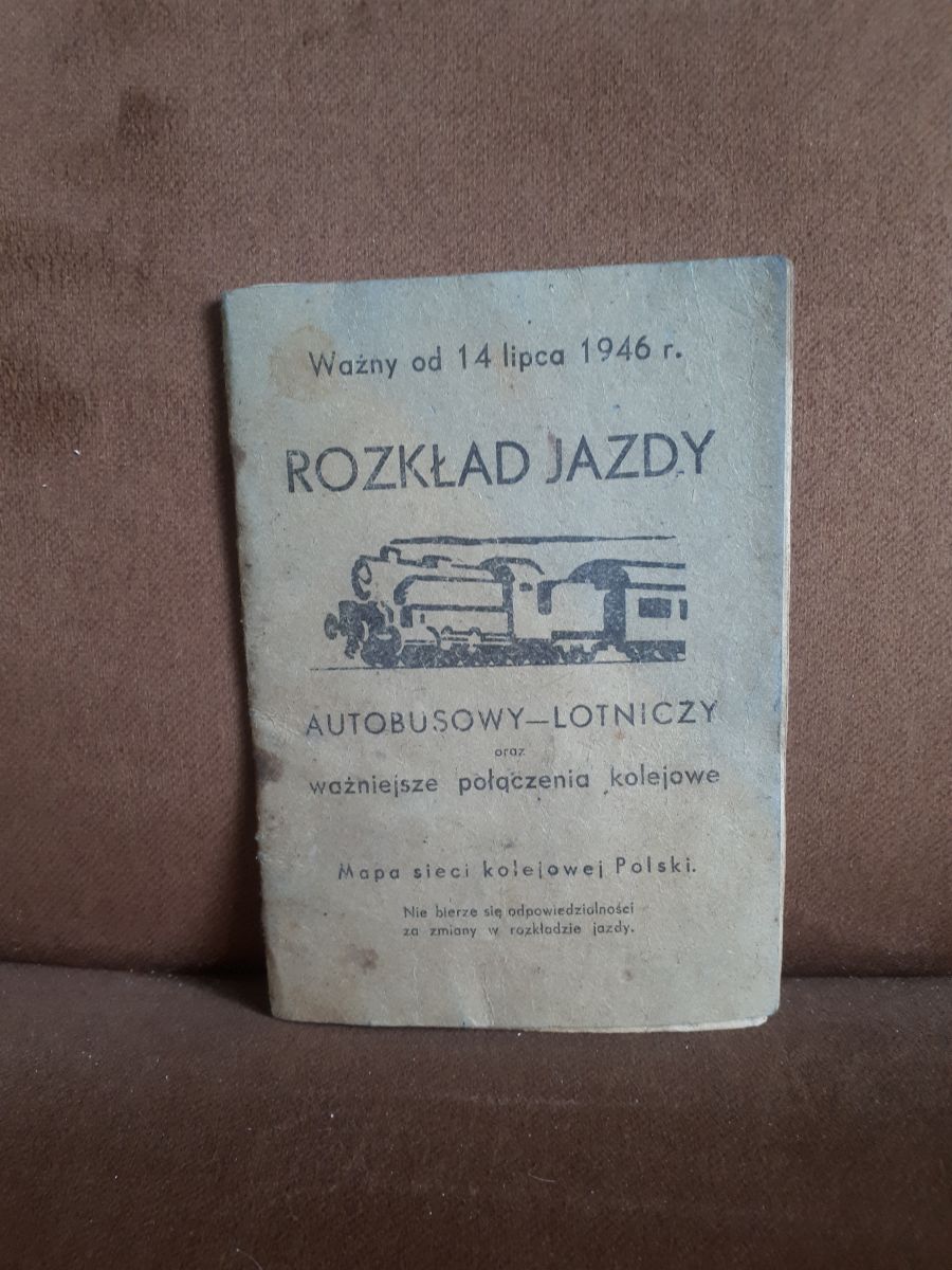 Rozkład jazdy autobusowy-lotniczy oraz ważniejsze połączenia kolejowe + mapa sieci kolejowej Polski – ważny od 14 lipca 1946 r